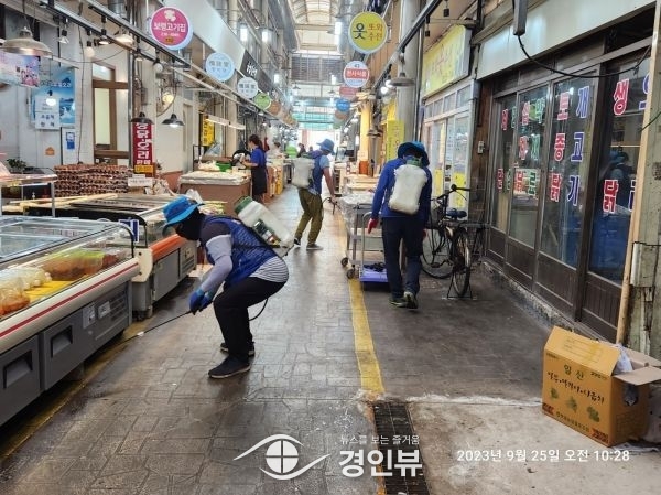 (경인뷰) 수원시 권선구보건소가 25일 추석 명절 많은 시민의 방문이 예상되는 권선종합시장과 수원 농수산물시장 곳곳을 방역 소독했다.