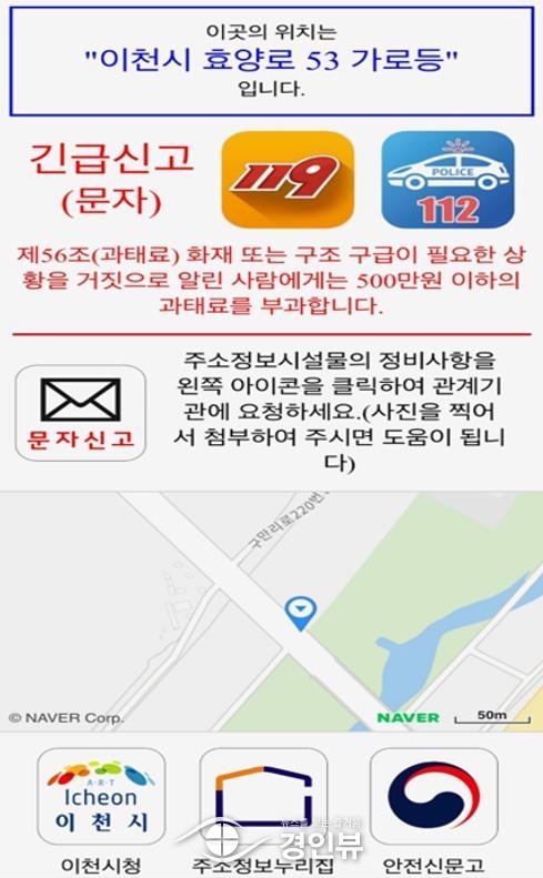 또한 기초번호판의 QR을 스캔하면 따로 문자내용 및 번호를 입력하지 않고도 이천시에서 운영중인 주소정보시설 안전신문고에 신고가 가능해, 추후 훼손된 기초번호판의 신속 조치가 가능할 것으로 예상된다.