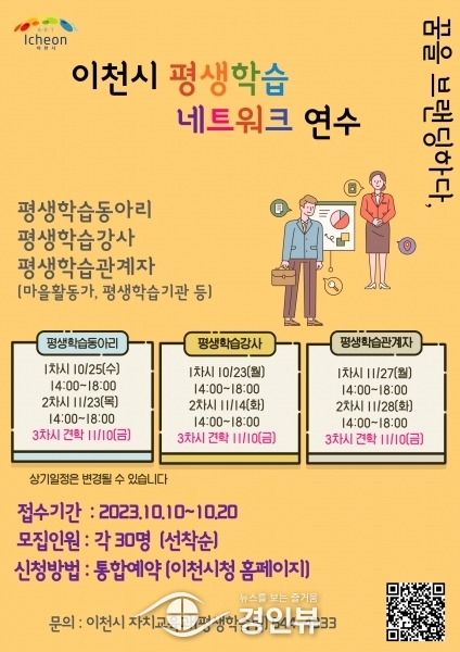 (경인뷰) 이천시는 지속가능한 평생학습도시 이천의 네트워크 구축을 위한 평생학습 강사, 동아리, 평생학습기관 등을 대상으로 역량강화 연수를 위해 10월 20일까지 수강생을 모집한다.