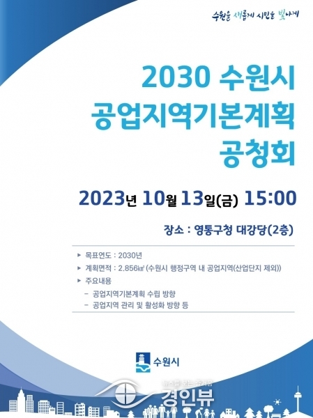 수원시는 10월 13일 오후 3시 영통구청 대강당에서 ‘2030년 수원시 공업지역기본계획 공청회’를 개최한다.