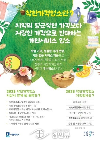 수원시 관계자는 “저렴한 가격과 우수한 서비스로 지역물가 안정에 기여하고 있는 착한가격업소를 활성화해 지역물가 안정화를 도모할 것”이라며 “시민들과 관광객들에게 양질의 서비스를 제공할 수 있도록 하겠다”고 말했다.