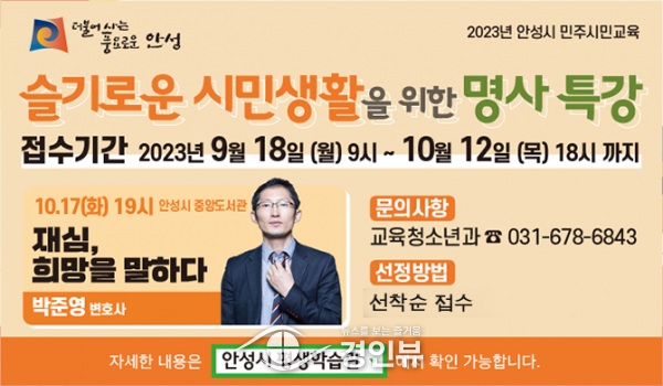 (경인뷰) 안성시는 민주시민교육 명사 특강 1회차를 오는 10월 17일 오후 7시 중앙도서관에서 개최한다.