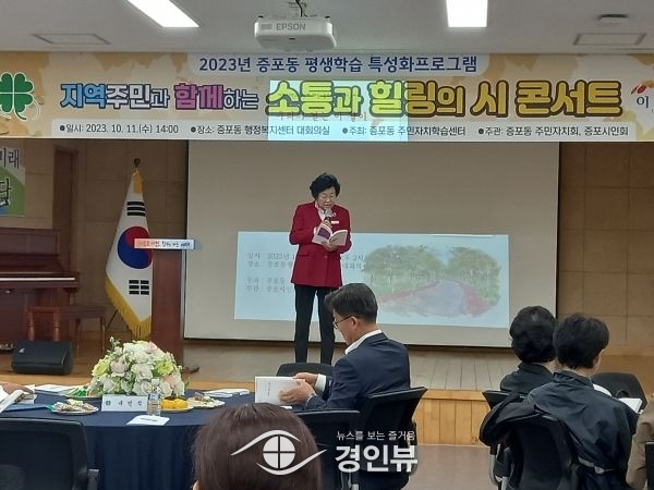 (경인뷰) 이천시 증포동은 11일 특성화 평생학습 프로그램 ‘지역주민과 함께하는 소통과 힐링의 시 콘서트”을 성황리에 개최했다.