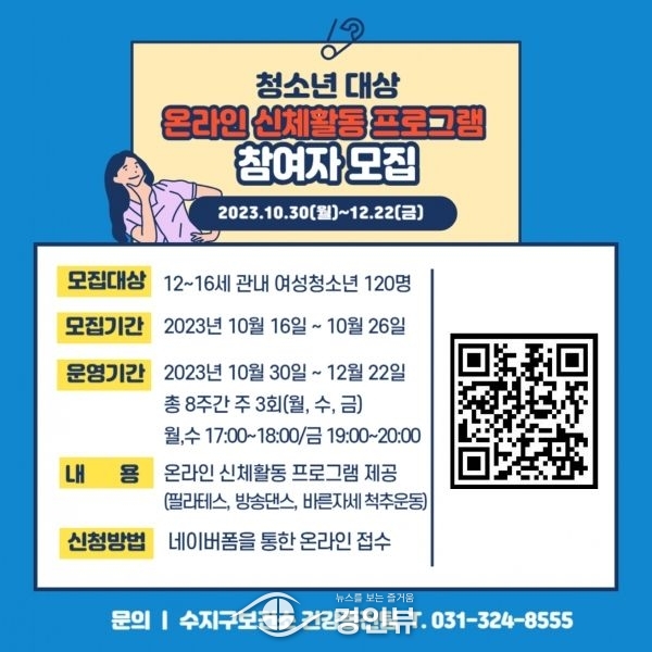 (경인뷰) 용인특례시 수지구보건소가 오는 26일까지 청소년 신체활동 프로그램에 참여할 여성 청소년 120명을 모집한다고 16일 밝혔다.