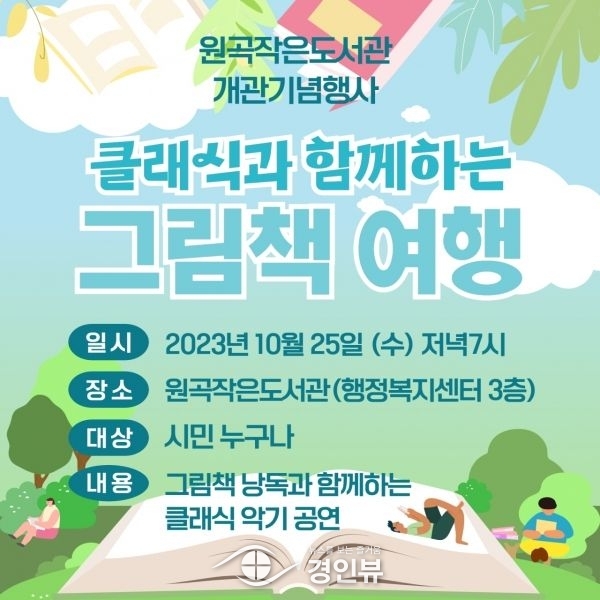 또한, 개관을 기념해 그림책 낭독과 악기연주가 어우러지는 ‘클래식과 함께하는 그림책 여행’ 행사가 10월 마지막주 25일 수요일 저녁 7시에 진행된다고 전했다.