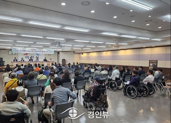 (경인뷰) 이천시장애인자립생활센터는 10월 17일 이천시청 대회의실에서 장애인과 장애인단체, 관련 담당자 150명이 참석한 가운데 이천시의 장애인 평생교육 지원체계 및 활성화 방안 모색을 위한 토론회를 진행했다.