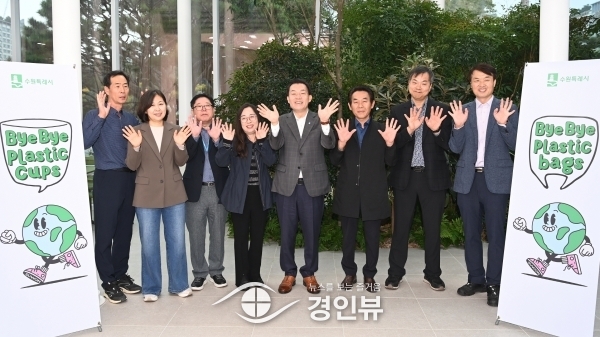 (경인뷰) 이재준 수원특례시장이 19일 수원시 공직자들과 함께 시청 본관 1층에서 ‘바이바이 플라스틱 챌린지’에 동참했다.