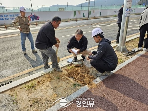 (경인뷰) 수원시와 한국토지주택공사가 건강한 도시 가로숲을 조성하기 위해 25일 당수지구 내 가로수 식재예정지 토양을 조사했다.