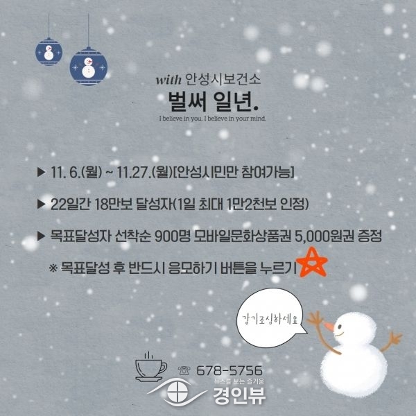 안성시보건소 건강증진과장 이지은은 “벌써 올 한해도 마무리 되는 계절이 온다”며 “건강에 유의하면서 가장 좋은 운동인 걷기를 항상 생활화하기 바란다”고 말했다.