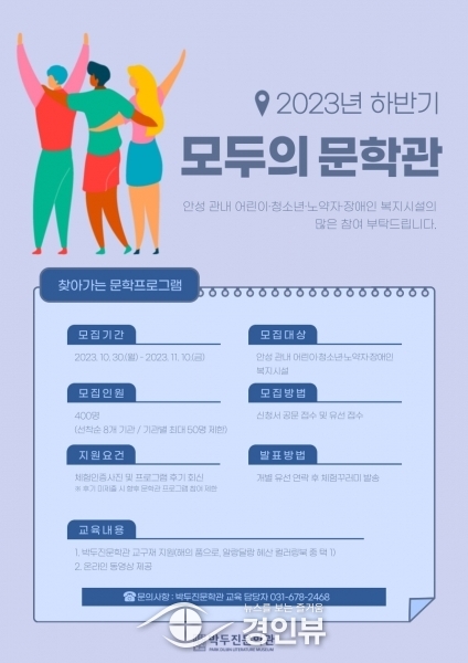 (경인뷰) 안성시 박두진문학관은 10월 30일부터 11월 10일까지 관내 복지시설을 대상으로 2023년 찾아가는 문학프로그램 ‘모두의 문학관’의 참여 기관 모집을 진행한다고 밝혔다.