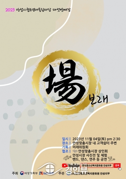 오는 11월 4일 오후 1시20분부터 4시까지 안성맞춤시장 內 고객쉼터 주변에서 시장의 역사와 문화를 알리고 지역 경제 활성화 기여 및 시장 상인들과 방문객들의 소통과 교류 촉진을 목적으로 2023 안성시청소년어울림마당 다섯 번째 장 ‘場보래’가 개최된다.