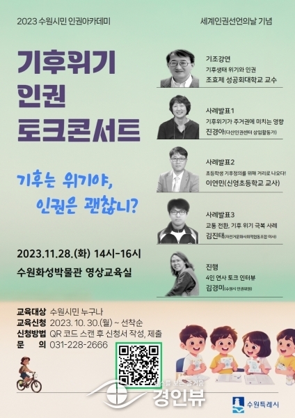 (경인뷰) 수원시가 기후 위기에 대응 방안을 모색하는 인권 토크콘서트 ‘기후위기×인권 토크콘서트’에 참가자 100명을 선착순으로 모집한다.
