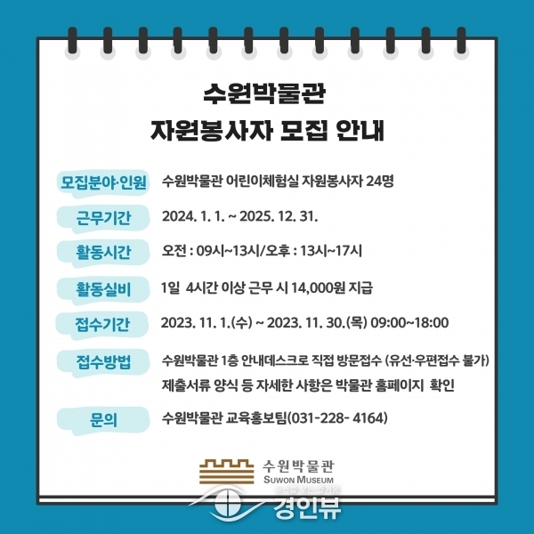 (경인뷰) 수원박물관이 11월 30일까지 어린이체험실 운영을 도울 자원봉사자 24명을 모집한다.
