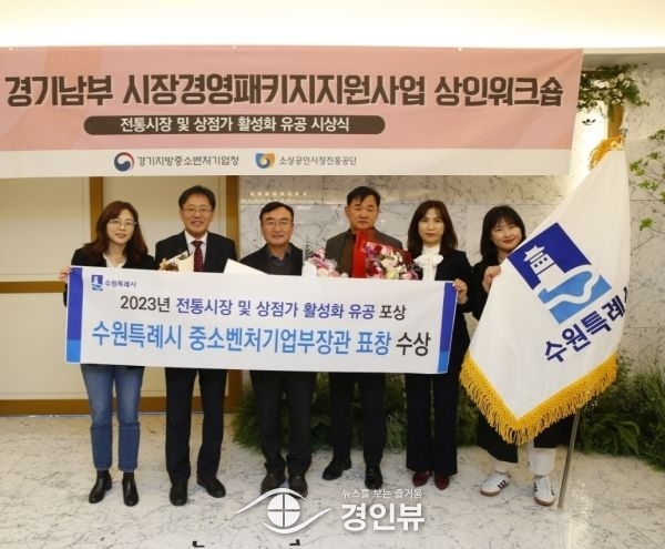 (경인뷰) 수원시가 8일 더마레보 호텔에서 중소기업벤처부가 주관한 ‘2023 전통시장 및 상점가 활성화 유공’ 지자체 부문 중기부 장관상을 수상했다.