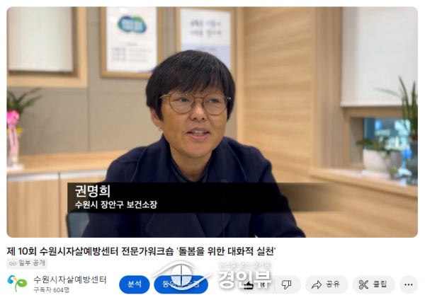 이어 안병은 수원시자살예방센터장이 ‘돌봄을 위한 대화적 실천’을 주제로 강의했고 백민정 수원시자살예방센터 상임팀장이 실제 사례를 바탕으로 한 대화적 접근 사례를 소개했다.