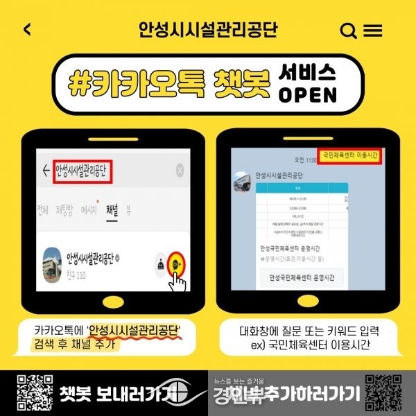 (경인뷰) 안성시시설관리공단은 정보 접근성 향상 및 소통 활성화를 위해 오는 13일부터 “365일 24시간 정보 전달이 가능한 카카오톡 챗봇 서비스”를 오픈했다고 밝혔다.
