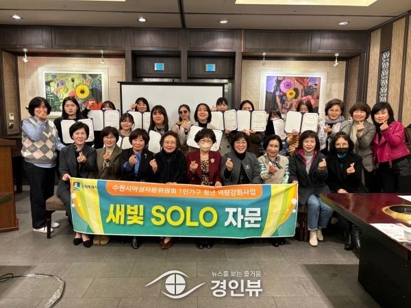 (경인뷰) 수원시가 수원시여성자문위원회와 함께 수원시 1인 가구 청년 16명을 대상으로 역량 강화 교육으로 진행된 ‘새빛 솔로 자문’ 수료식이 15일 인계동 한 음식점에서 열렸다.