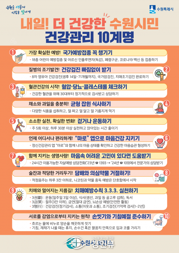 ‘내일 더 건강한 수원시민 건강관리 10계명’은 국가예방접종 꼭 챙기기 건강검진 빠짐없이 받기 혈압·당뇨·콜레스테롤 체크하기 균형 잡힌 식사하기 걷거나 운동하기 ‘마로’ 앱으로 마음건강 지키기 마음속 어려운 고민이 있다면 도움받기 담배와 의심 약물 거절하기 치매예방수칙 3.3.3. 실천하기 손 씻기와 기침예절 준수하기 등이다.