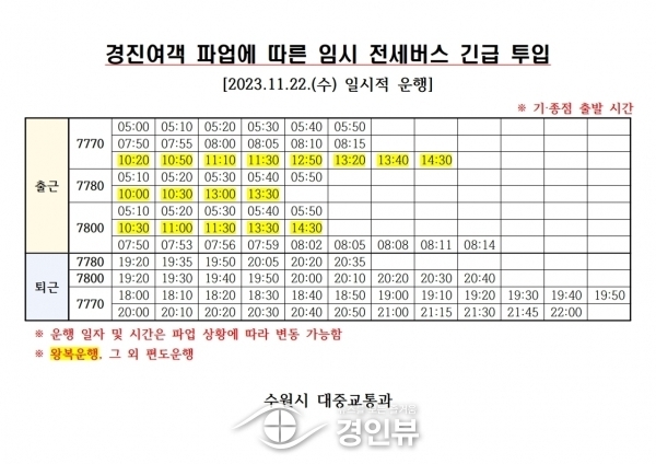 수원시는 출퇴근 시간에 맞춰 전세버스 50대를 투입해 7770번, 7780번, 7800번 3개 노선을 운영할 계획이다.
