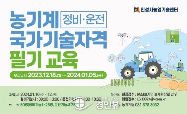(경인뷰) 안성시농업기술센터는 오는 12월 18일부터 24년 1월 5일까지 농기계 국가기술 자격교육 필기 과정 교육생을 모집한다고 밝혔다.