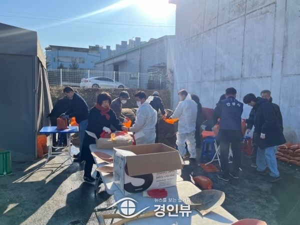 (경인뷰) 원곡면은 11월 28일 주민자치위원회, 이장단협의회, 새마을 부녀회, 자율방재단을 주축으로 원곡면 주민자치센터 주차장 앞 제설장에서 겨울철 사전대비 모래주머니를 제작했다.