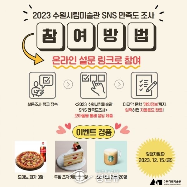 만족도 조사 참여는 수원시립미술관 공식 SNS 이벤트 게시글에 게재된 온라인 설문 링크에 접속해 설문 문항에 응답하면 된다.
