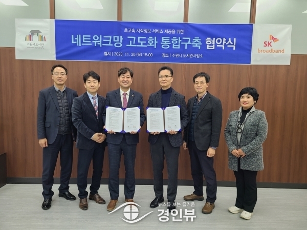 (경인뷰) 수원시도서관사업소와 SK브로드밴드는 11월 30일 선경도서관에서 ‘네트워크 고도화 통합구축 협약’을 체결하고 수원시도서관에 초고속 지식정보 서비스를 구축하는 데 협력하기로 했다.
