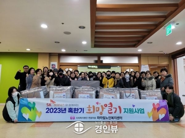 (경인뷰) 안성시 노인맞춤돌봄서비스 수행기관인 파라밀노인복지센터는 추워지는 겨울을 대비해 어르신들이 따뜻하게 지낼 수 있도록‘SK하이닉스와 함께하는 2023년 혹한기 희망열기 지원사업’을 통해 온열용품 겨울이불세트와 전기매트를 환경이 어려운 30명의 독거어르신에게 전달했다.