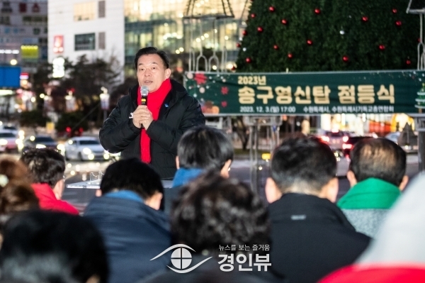 3일 저녁 열린 ‘2023 송구영신탑 점등식’에 참석한 이재준 수원특례시장은 “성탄 트리의 환한 불빛이 세상을 밝고 따뜻하게 만드는 희망의 불빛이 되길 바란다”며 “모든 이에게 따뜻한 세상이 되도록 수원시도 힘을 보태겠다”고 말했다.