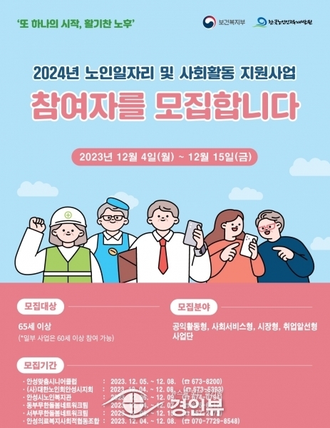 노인일자리 참여자 모집은 12월 4일 월요일부터 12월 15일 금요일까지 집중 운영되며 2024년도 노인일자리 수행기관 6개소에서 통합 접수할 예정이다.