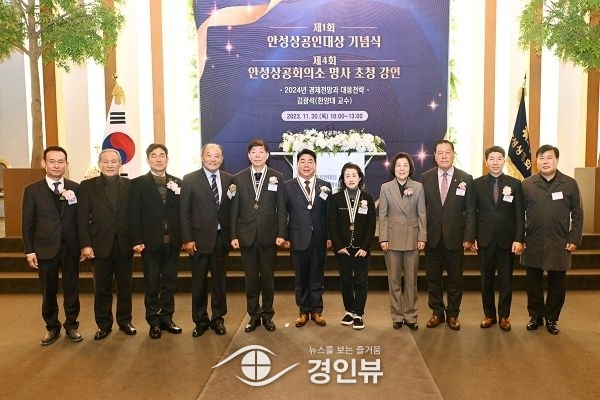 (경인뷰) 안성상공회의소는 11월 30일 안성 THE AW 웨딩컨벤션에서 ‘제1회 안성상공인대상 기념식’ 및 ‘제4회 안성상공회의소 명사초청 강연회’를 김보라 안성시장, 안정열 안성시의회 의장, 배영환 안성소방서장, 정순범 평택세무서장, 최장선 평택고용노동지청장 등 각 기관장과 안성상공회의소 의원 및 기업체 대표, 임직원 160여명이 참석한 가운데 개최했다.