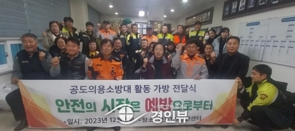 (경인뷰) 안성시 공도의용소방대는 지난 5일 공도119안전센터에서 각종 재난발생 시 초동대처를 할 수 있는 다목적가방 전달식을 가졌다.