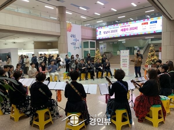 (경인뷰) 수원시 가족여성회관이 11일 시청 본관 로비에서 수강생들의 재능 나눔 행사 ‘빛났다 2023 새롭다 2024’를 열었다.