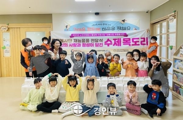 이번에 전달된 목도리는 선배시민 자원봉사단‘뜨담봉사단’에 참여하고 있는 14명의 봉사 어르신이 “아이들이 추운 겨울 따듯하게 보냈으면 하는 마음”을 담아 손수 제작한 수제목도리이다.