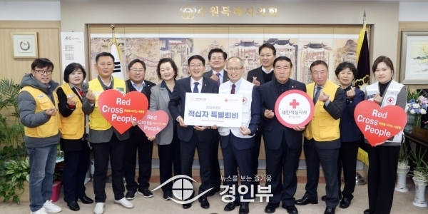 (경인뷰) 수원시특례시의회가 11일 의장실에서 개최된 2024년 적십자 특별회비 전달식에서 대한적십자사 경기도지사에 100만원을 전달했다.