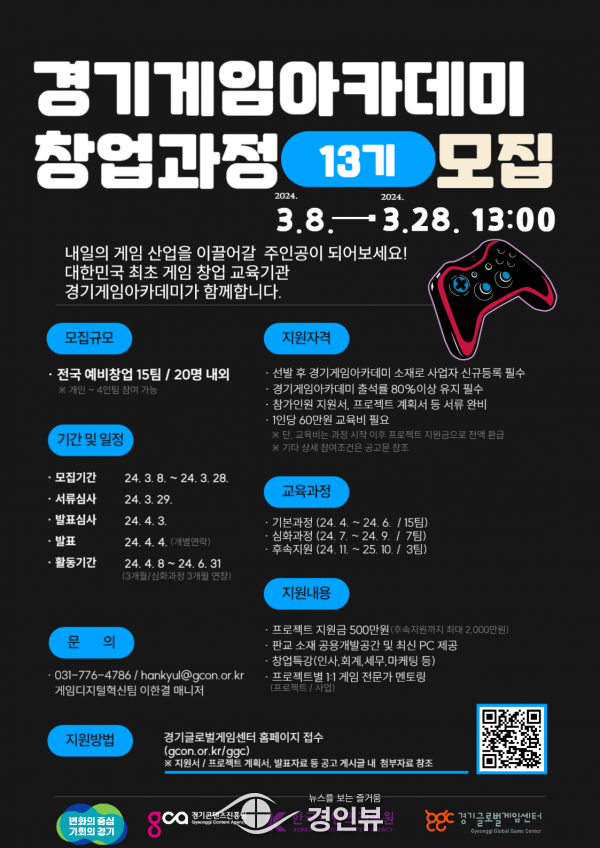 (경인뷰) 경기도와 경기콘텐츠진흥원이 ‘2024년 경기게임아카데미 창업과정 13기’ 사업에 참여할 예비 게임창업팀을 오는 28일까지 모집한다.