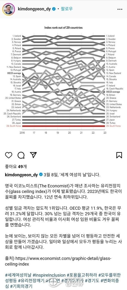 김동연 지사는 이날 자신의 누리소통망을 통해 “영국 이코노미스트가 매년 조사하는 유리천장지수가 발표됐는데, 2023년에도 한국이 꼴찌를 차지하며 12년 연속 최하위다”며 “성별 임금 격차도 압도적 1위로 OECE 평균이 11.9%인데 한국은 무려 31.2%로 30% 넘는 임금 격차는 29개국 중 한국이 유일하다”고 지적했다.