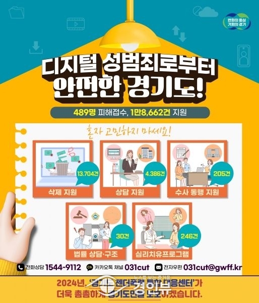 경기도가 ‘경기도 디지털 성범죄 피해자 원스톱 지원센터’를 통해 지난 한 해 동안 피해자 489명에게 상담, 피해영상물 삭제, 법률지원, 수사 연계, 심리 치유 지원 등 1만 8천662건을 지원했다고 12일 밝혔다.