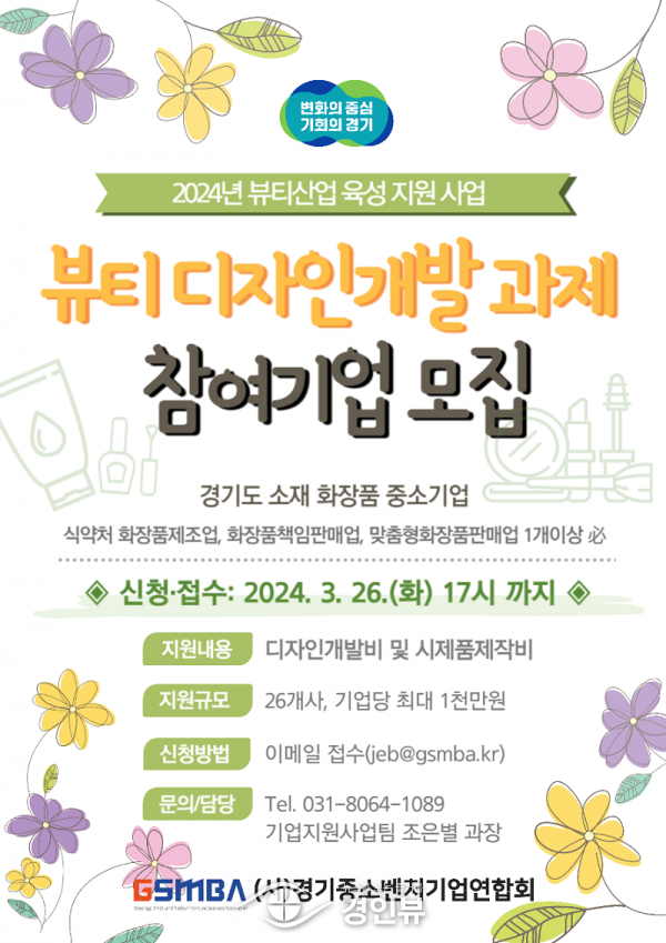 (경인뷰) 경기도와 경기중소벤처기업연합회가 2024년 뷰티산업 육성 지원 사업에 참여할 도내 뷰티 중소기업 26개 사를 이달 26일까지 공개 모집한다.