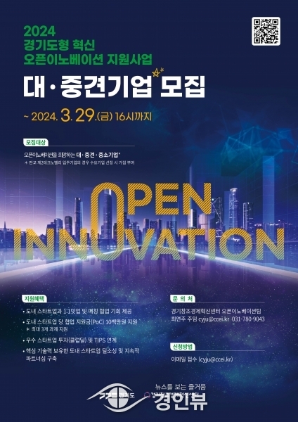 (경인뷰) 경기도와 경기창조경제혁신센터는 대·중견기업과 스타트업의 동반성장을 위한 ‘경기도형 혁신 오픈이노베이션 지원’에 참여할 대·중견기업을 29일까지 모집한다.