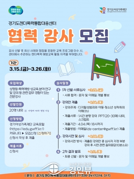 (경인뷰) 경기도여성가족재단이 운영하는 경기도젠더폭력통합대응센터는 디지털성범죄, 아동·청소년 성착취 등 젠더폭력 인식 개선 및 폭력 예방을 위해 강의할 전문강사 20명을 오는 26일까지 모집한다.