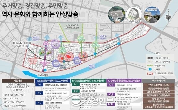 도시재생활성화계획 내용을 보면 안성시 성남동과 옥천동 일대 15만 2천728㎡ 규모의 구도심 일대를 대상으로 ‘주거맞춤, 경관맞춤, 주민맞춤 역사·문화와 함께하는 안성맞춤’이라는 비전을 내세웠다.