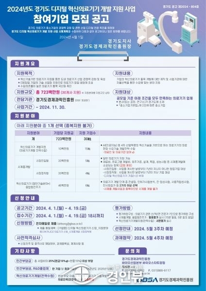(경인뷰) 경기도와 경기도경제과학진흥이 ‘2024년 디지털 혁신의료기기 개발 지원사업’에 참여할 도내 의료기기 기업 30개사를 19일까지 공개 모집한다.