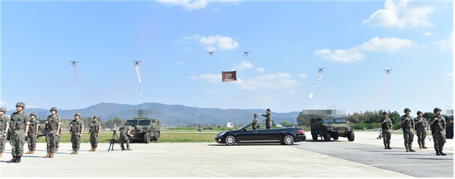 ▲ 드론작전사령부 창설식에서 김승겸 합참의장과 초대 드론작전사령관 이보형 소장이 열병을 하고 있다. 2023.9.1 ⓒ 합동참모본부 제공