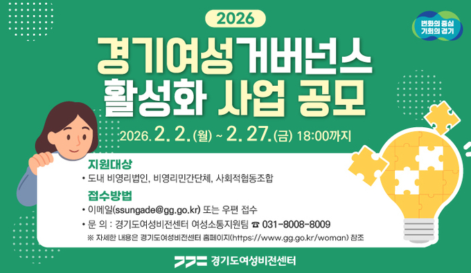 경기도여성비전센터가 오는 2월 27일까지 경기여성거버넌스 활성화 공모사업 수행 단체를 모집한다.