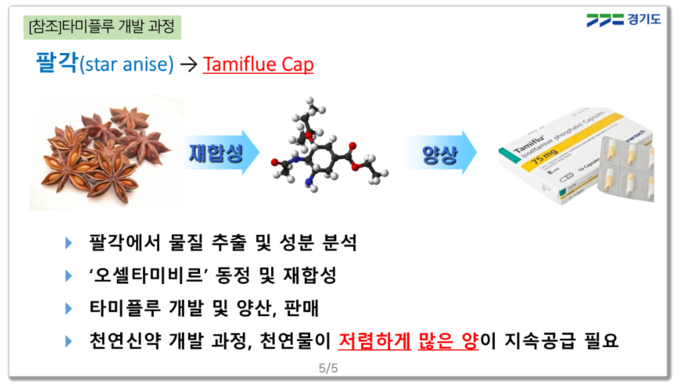 그동안 인류가 면역력을 갖지 못한 바이러스성 질병 관련 백신과 치료제 개발이 지속되고 있지만, 치료제의 경우 기존 의약품의 전환보다 신약 개발이 필수적이며, 독감 치료제 타미플루의 사례처럼, 개발 과정에서 식물 등 자연 자원이 중요한 단서가 되는 경우가 많다.