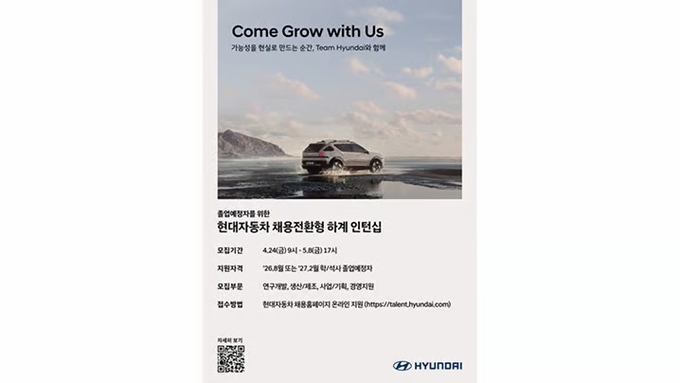현대차는 모빌리티 혁신을 이끌어갈 우수 인재를 조기에 발굴하고, 재학생에게 실무 경험 기회를 폭넓게 제공하기 위해 채용전환형 인턴십을 기획했다며, 지원 절차를 대폭 간소화한 만큼 창의적이고 열정적인 인재들의 적극적인 지원을 기대한다고 밝혔다.