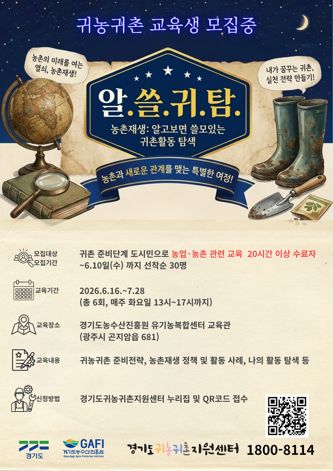 경기도농수산진흥원은 6월 10일까지 ‘농촌재생: 알고보면 쓸모있는 귀촌활동 탐색(알쓸귀탐)’ 교육생을 모집한다.