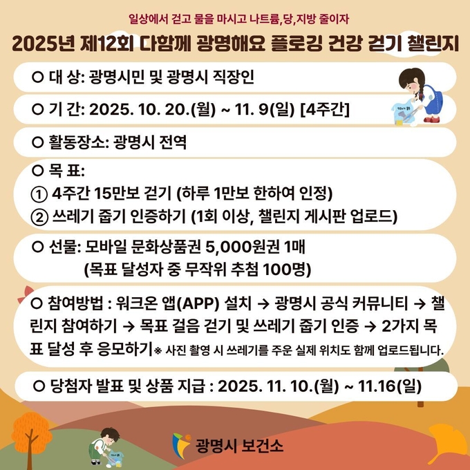 광명시(시장 박승원) 보건소는 오는 20일부터 11월 9일까지 4주간 ‘제12회 다함께 광명해요! 플로깅 건강 걷기 챌린지’를 운영한다.