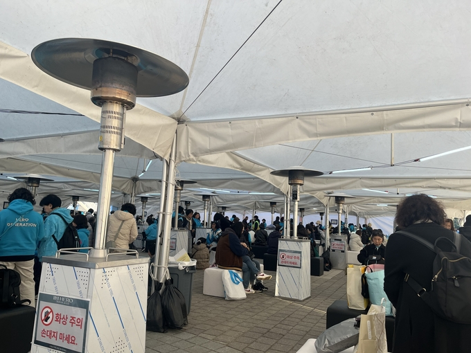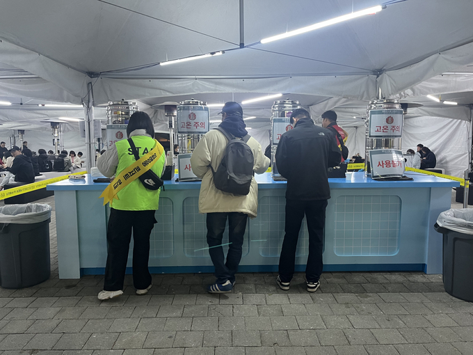 아임히어로라운지는 난방기와 의자, 따뜻한 차까지 준비되어 추운 날씨 속에서도 편안하게 머물 수 있었다. 사진에서도 보이듯 넓은 텐트 아래 많은 사람들이 휴식을 취하고 있었고, 스태프들이 곳곳에서 안내를 돕는 모습도 보였다. 라운지 곳곳에는 ‘화상 주의’ 안내문이 붙어 있어 세심함을 더했다.